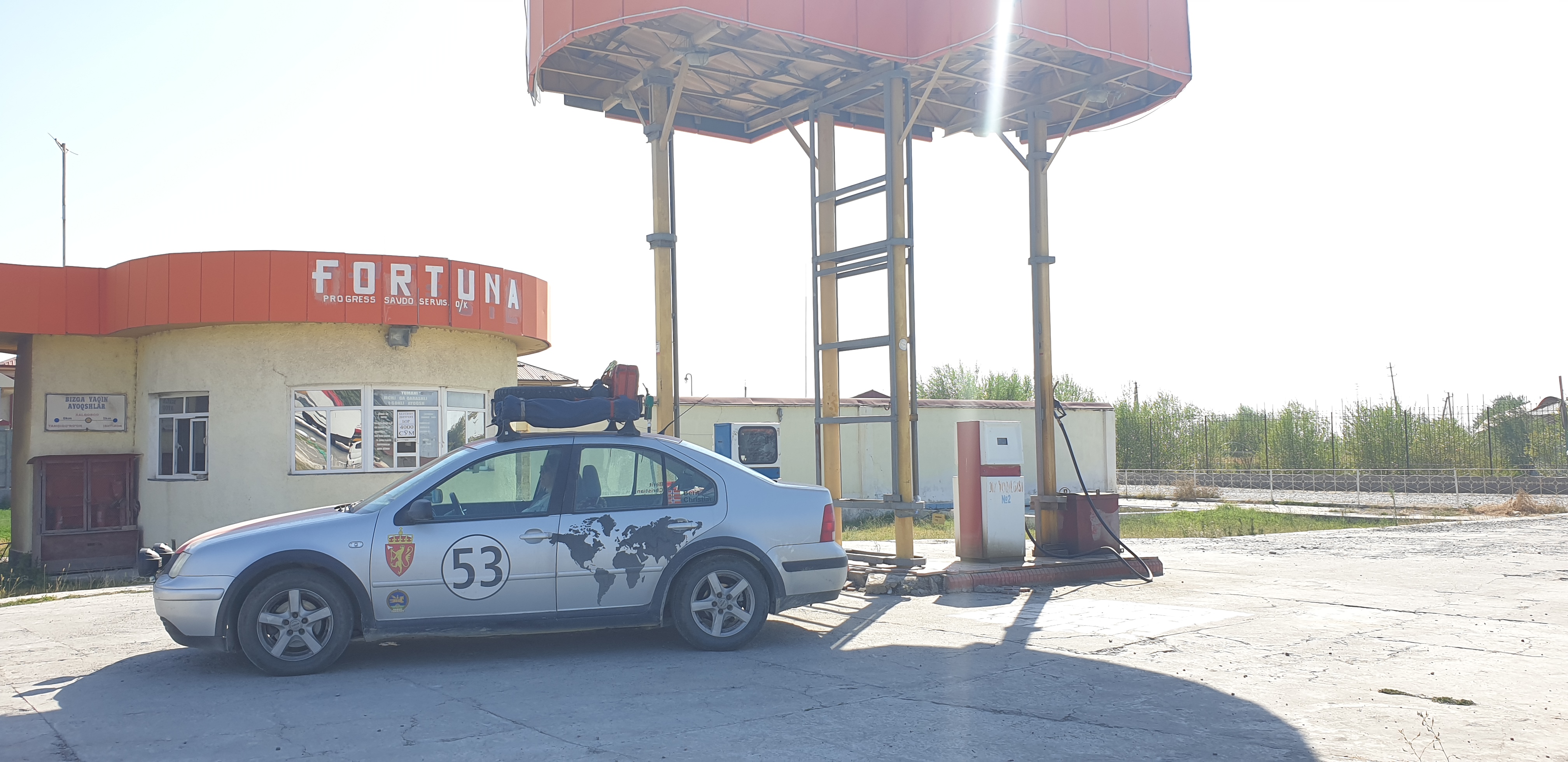 Helt siden den ekstremt dårlige veien etter grenseovergangen inn i Usbekistan har vi slått fast at bilen må heves og få en større bakkeklaring. Det burde være en smal sak å fikse med gummiklosser i fjærene for eksempel, men å forklare dette på tegnspråk til gateverkstedene har vist seg å være vanskelig. Vi trodde et øyeblikk vi var heldige da det siste verkstedet vi var innom sa at dette var en easy-fix (for godt til å være sant dette også) og dro frem kompressor med slange og fylte to ekstra bar i alle dekkene. Bilen ble kanskje en halv cm høyere, men det var ikke akkurat dette vi tenkte var løsningen. Kjøreegenskapene ble desto verre og vi måtte innom enda et verksted for å slippe ut lufta igjen(!).
