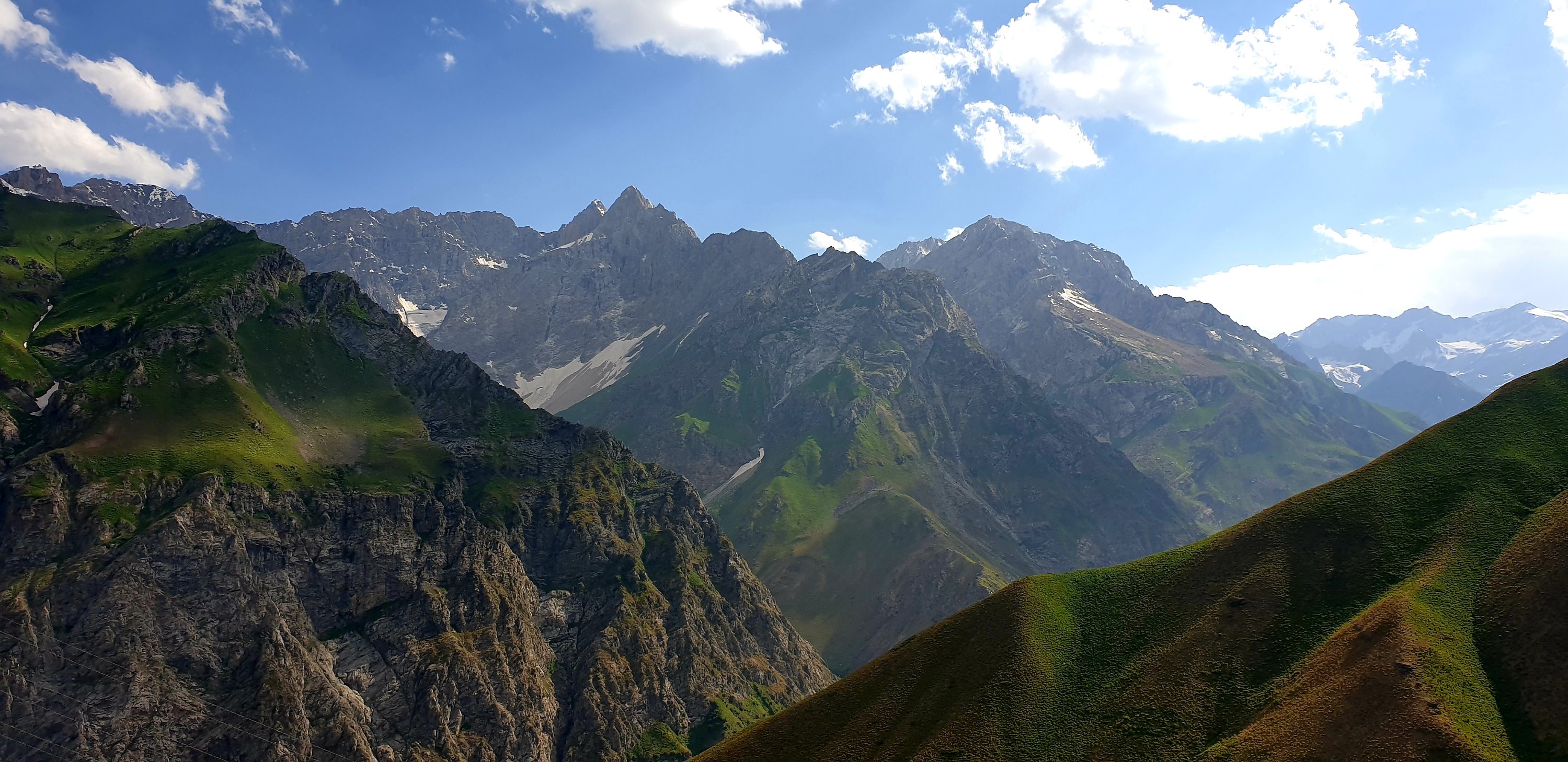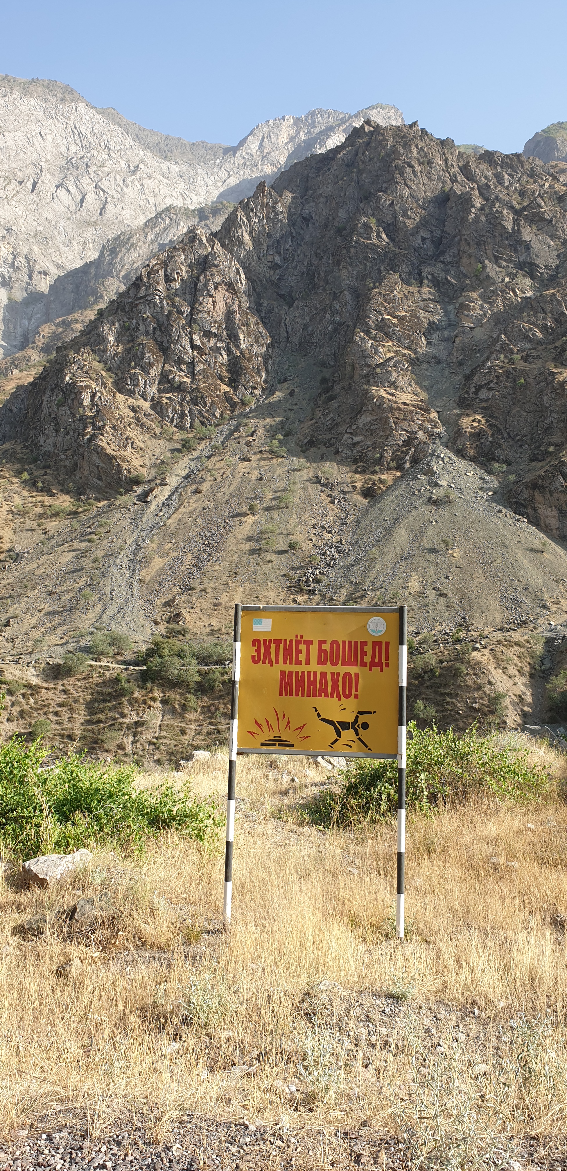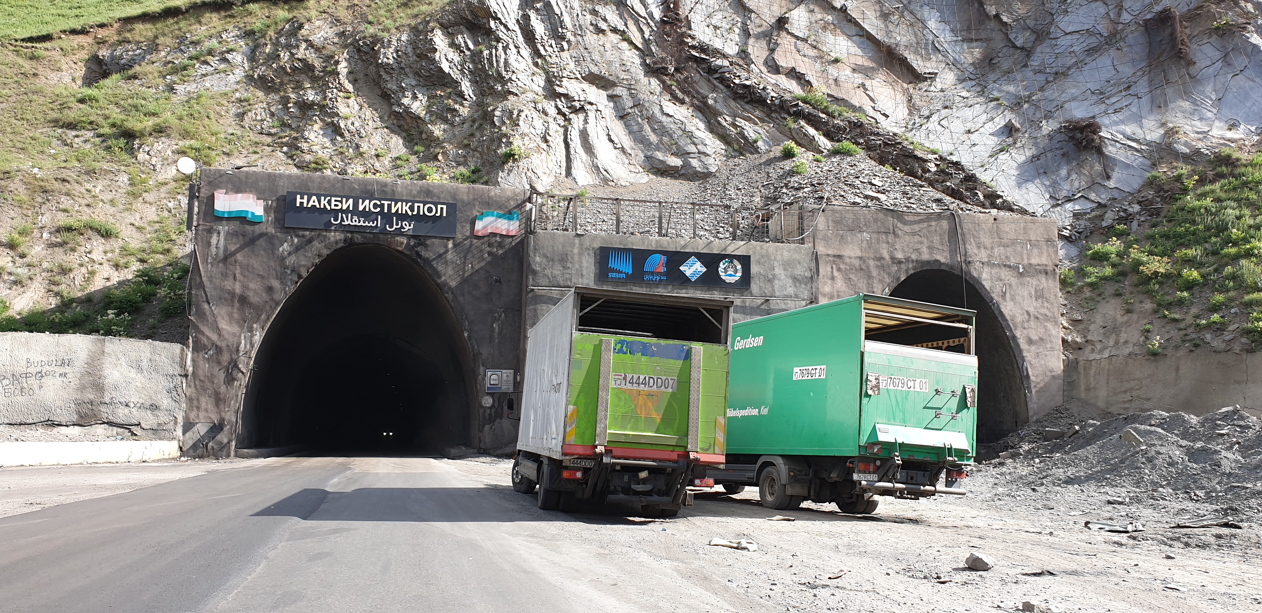 Snøen lå fremdeles i fjellsidene til tross for mellom 20 og 30 varmegrader! Høyeste punkt var på rundt 2500 m.o.h, og det var mange biler og lastebiler som kokte på vei opp mot toppen. Veien manglet definitivt rassikring og flere steder var det ene kjørefeltet helt sperret av stein og jord som hadde rast ned fjellsiden. Veien gikk også gjennom Anzob tunnel som på folkemunne kalles for «Tunnel of death». Vi skulle ikke langt inn i tunellen før vi forsto bakgrunnen for kallenavnet.