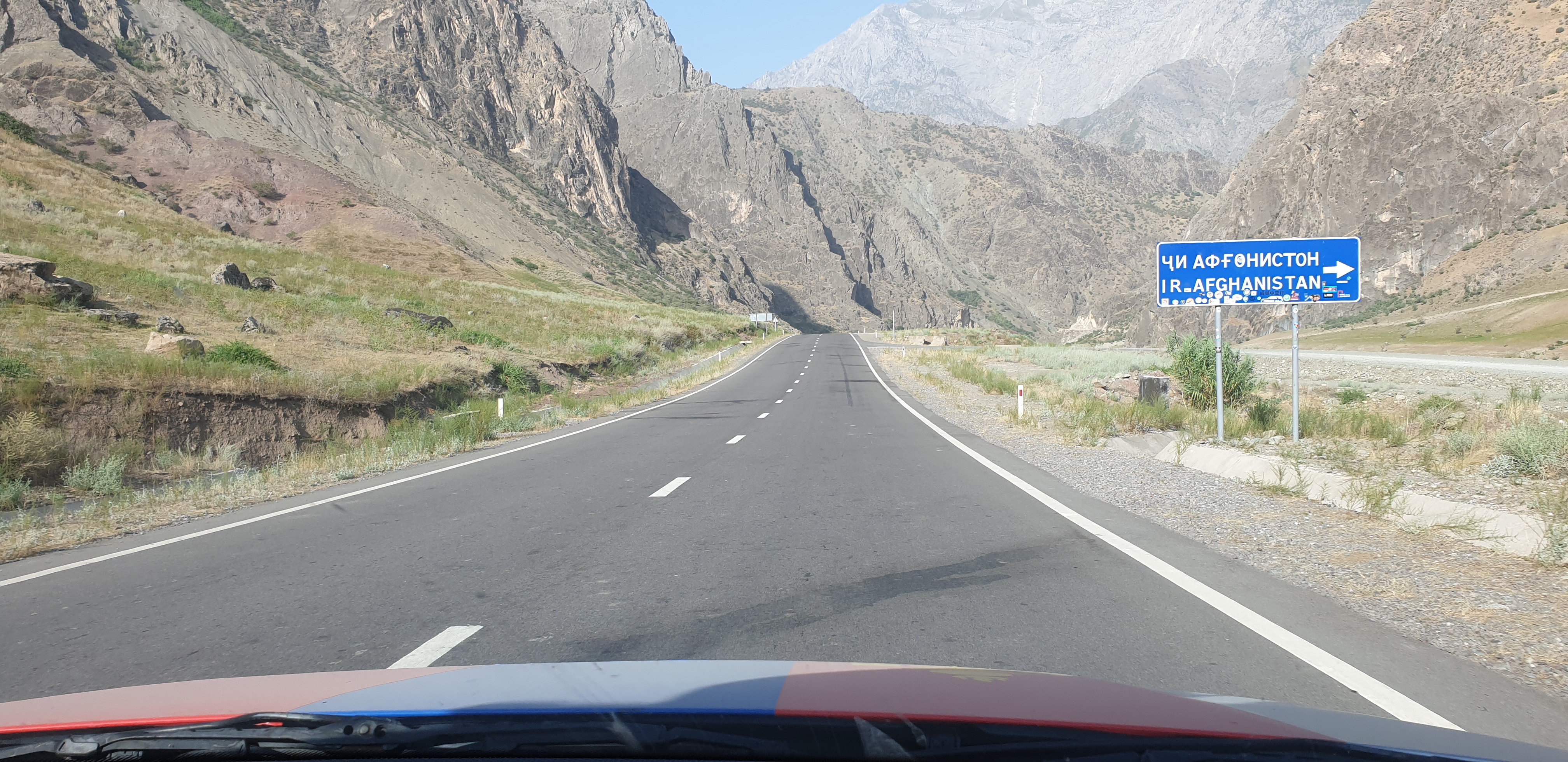 Grensepasseringen inn i Tadjikistan gikk relativt smertefritt og vi skulle ikke mange hundre meterne inn i landet før det ble en total landskapsforvandling. Fra å ha vært i brun sand og ørken i 5 dager møtte vi høye fjell og grønne frodige fjellsider.